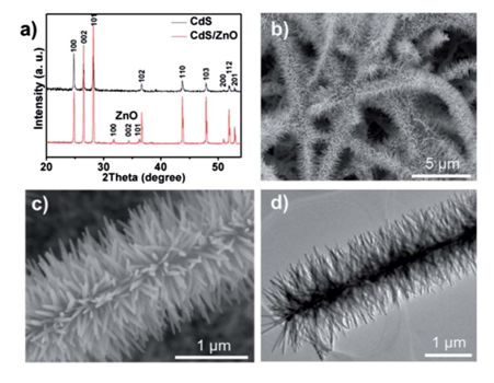圖1:(a)CdS納米帶與CdS/ZnO樹枝狀異質結的XRD峰對比。(b)低倍數(shù)SEM下觀測到的CdS/ZnO樹枝狀異質結。(c)(d)分別對應SEM和TEM下觀測到的CdS/ZnO樹枝狀異質結。