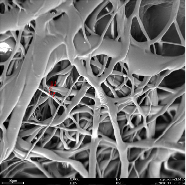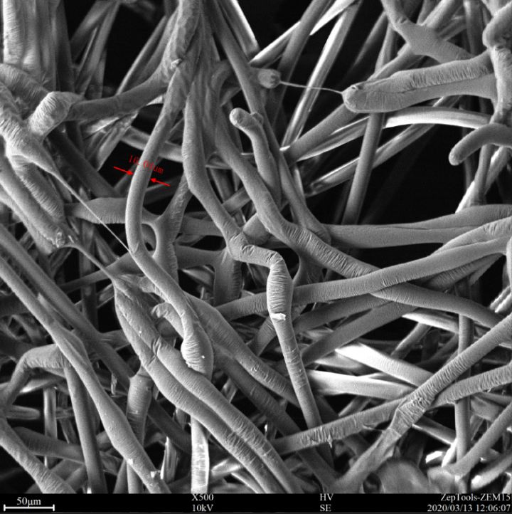 圖2 醫(yī)用外科口罩1中間過濾層(熔噴布層)的掃描電鏡照片??梢钥吹皆搶用芗挪贾? - 15 um的纖維結(jié)構(gòu)。